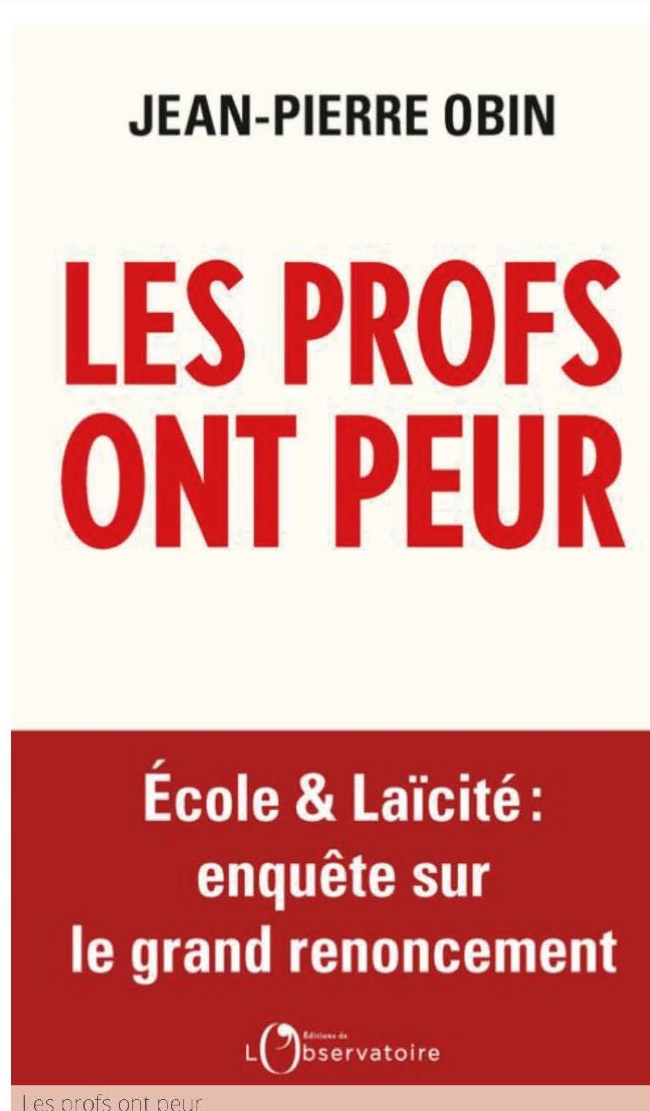 Le dernier ouvrage de Jean-Pierre Obin "Les profs ont peur / Ecole et Laïcité : enquête sur le grand renoncement" paraîtra le 11 octobre aux éditions de L'Observatoire